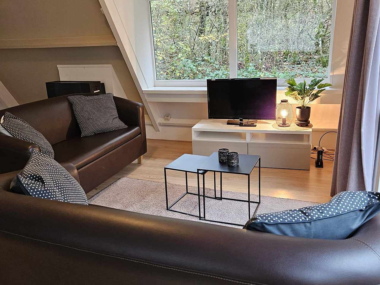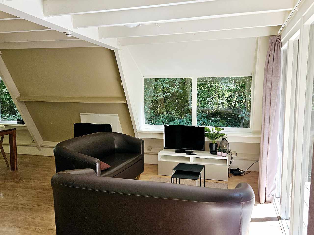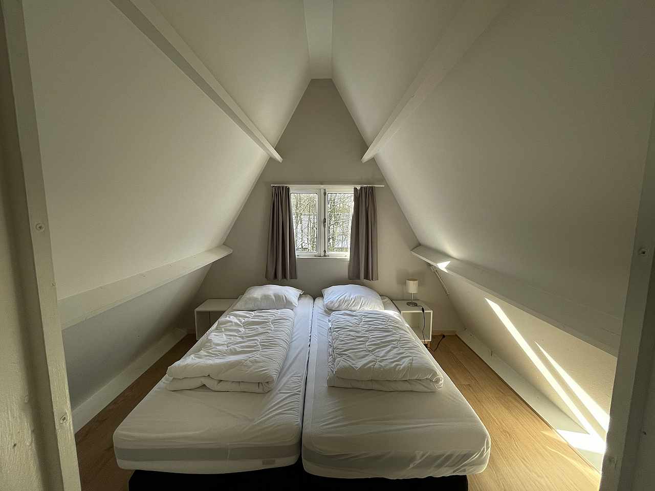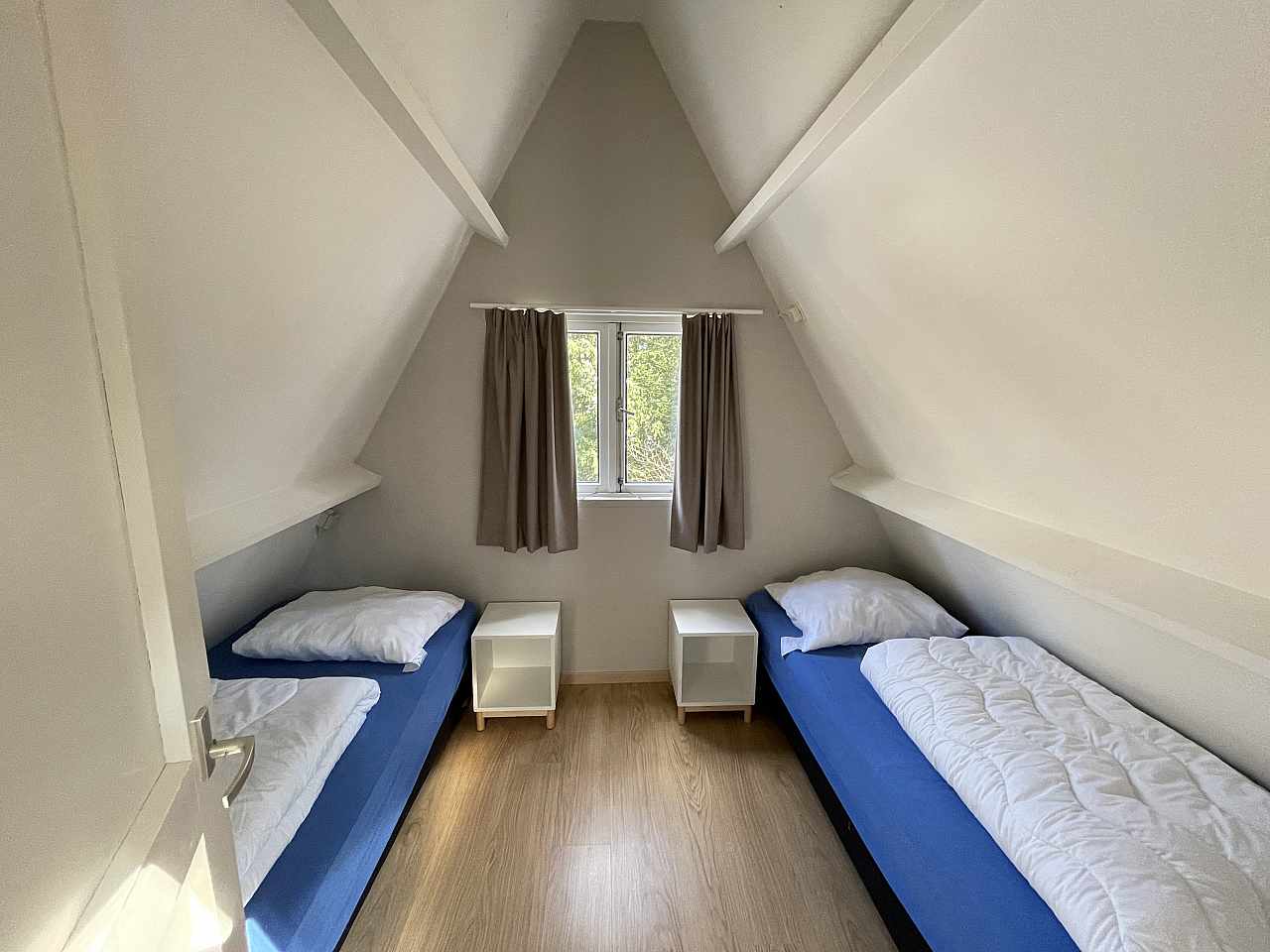 Ce bungalows peut accueillir jusqu'à 5 personnes. La cuisine, le séjour et la salle de douche avec WC se situent au rez-de-chaussée. Les lits sont répartis dans deux chambres et sur le palier à l'étage.