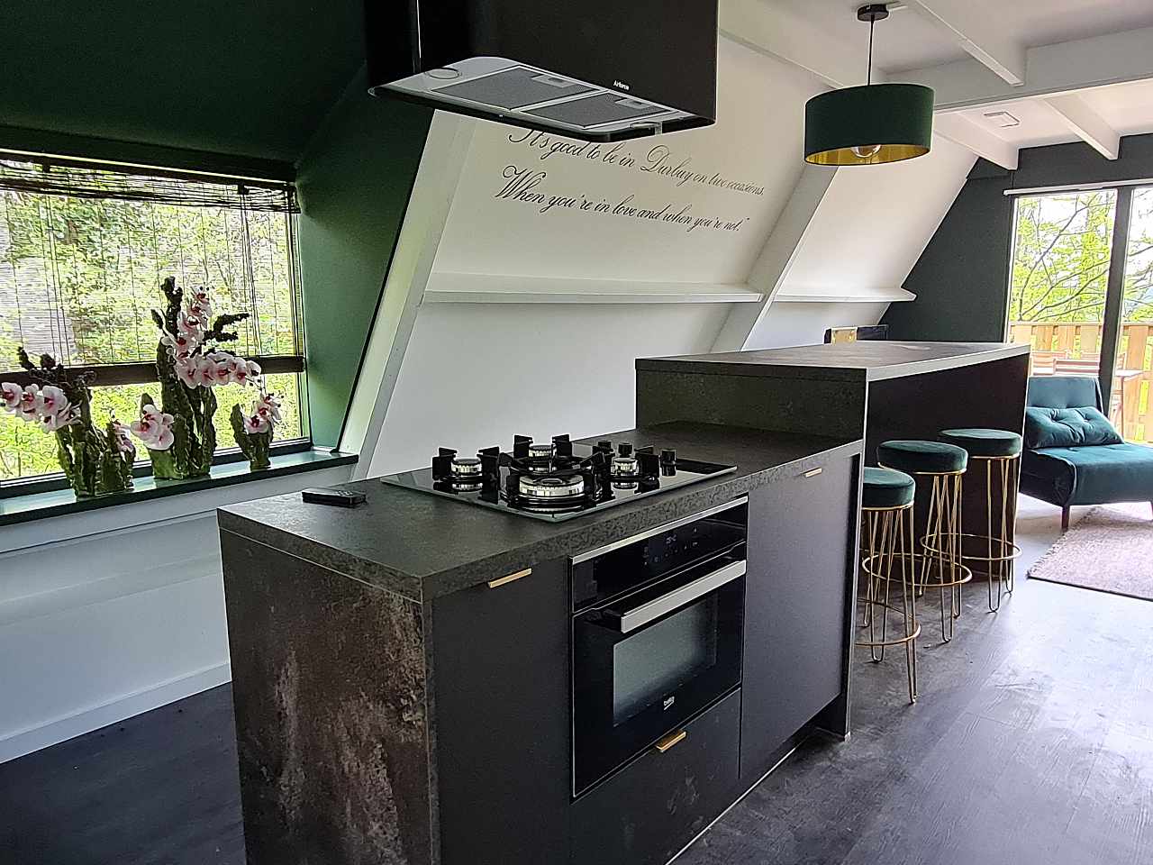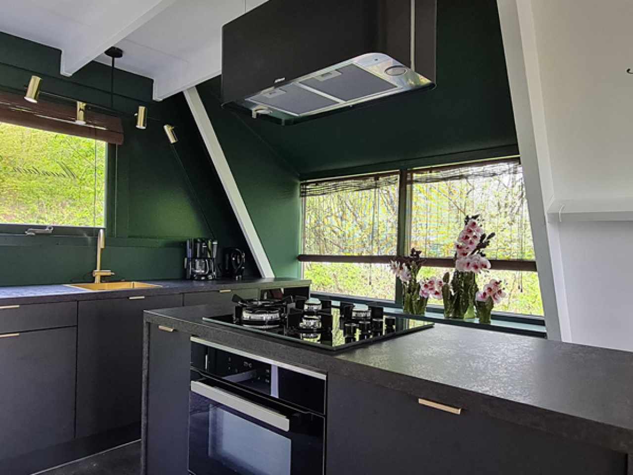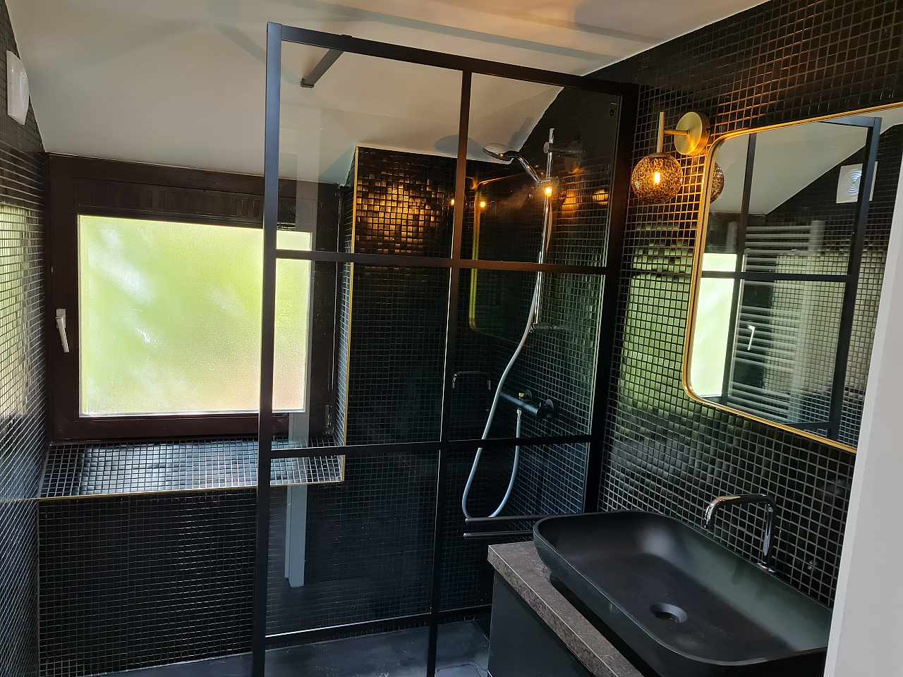 Le rez-de-chaussée comprend une cuisine ouverte avec îlot. Il y a une salle de bain moderne avec une douche et un lavabo. Il y a également une toilette séparée.